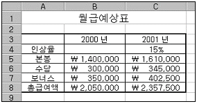 아래 월급예상표에서 2001년도 총 급여액 [C8]을 ₩2,500,000으로 맞추기 위해 인상률 [C4]를 어느 정도 조절해야 그 목표값을 찾고자 한다. 다음 중 옳게 표시된 목표값 대화상자는?