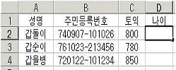 아래 그림에서 주민등록번호를 이용해 [D2] 셀에 나이를 구할 때의 수식으로 올바른 것은?