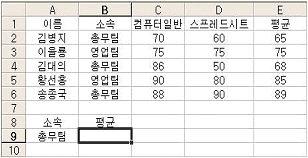 아래의 시트에서 총무팀의 컴퓨터일반 점수의 평균을 구하는 수식으로 옳은 것은?