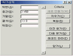 [데이터]-[레코드 관리]을 실행하여 [조건] 단추를 클릭한 후 다음과 같이 조건을 입력한 후, [이전 찾기]나 [다음 찾기] 단추를 클릭 했을 때 표시되는 레코드의 값 중에서 중간과 결석의 데이터가 맞게 짝지어진 것은 어느 것인가?