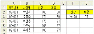 신장이 170 이상인 사원 중에서 가장 높은 체중을 구하려고 한다. 다음 [G3] 셀에 입력할 수식으로 올바른 것은?