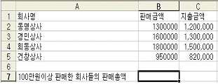 다음에서 100만원이상 판매한 회사들의 판매금액에 대한 판매총액을 구하고자 한다. 가장 알맞은 함수식은?