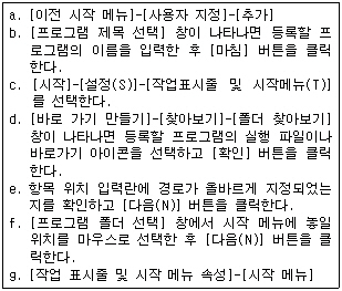 한글 Windows의 [시작] 메뉴에 프로그램을 등록하기 위한 작업 순서로 옳은 것은?