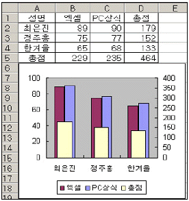 다음 그림과 같은 이중 축 차트에 관한 설명으로 옳지 않은 것은?