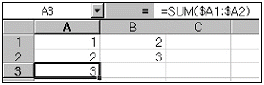 [A3]셀에 입력된 수식은 =SUM($A1:$A2)이다. 이 셀을 [B3]셀에 복사하였을 때 [B3]셀에 표시되는 값은?