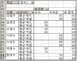 아래에 주어진 피벗 테이블의 레이아웃에서 페이지, 행, 열, 데이터의 각 항목에 대한 설정이 옳게 나열된 것은?