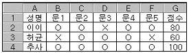 아래 워크시트에서 문항 답안의 O/X 채점 결과에 대하여 O 이면, 한 개당 20점으로 점수를 계산하는 [G2]셀의 수식으로 옳은 것은?