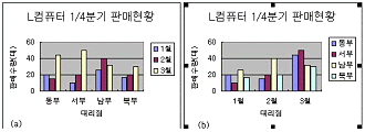 (a)의 차트에서 월별로 각 대리점의 판매현황을 쉽게 비교하기 위하여 (b)와 같은 차트로 변경하려고 할 때 옳은 것은?