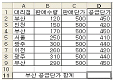 아래 워크시트에서 ‘부산’ 대리점의 공급단가의 합계를 구하려고 한다. 다음 중 합계를 구하기 위한 수식으로 옳지 않은 것은?