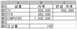 ‘가격’에 ‘인상률’을 적용하여 ‘인상 가격’을 계산하고자 한다. [C2] 셀의 수식을 [C4] 셀까지 채우기 핸들로 끌어 계산하고자 할 때 [C2]셀에 들어갈 수식으로 알맞은 것은?