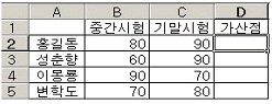 아래의 성적 데이터에서 중간시험과 기말시험을 비교하여 기말시험이 큰 경우에만 향상된 점수의 20%를 가산점으로 주려고 한다. 다음 중 [D2] 셀에 가산점 계산에 대한 수식으로 옳지 않은 것은?