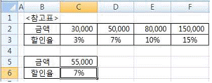 다음 중 아래 워크시트에서 참고표를 참고하여 55,000원에 해당하는 할인율을 [C6]셀에 구하고자 할 때의 적절한 함수식은?