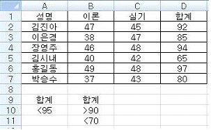 다음 중 아래 그림의 표에서 조건범위로 [A9:B11] 영역을 선택하여 고급필터를 실행한 결과의 레코드 수는?