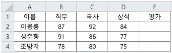 다음 중 아래 워크시트에서 '직무'가 90 이상이거나, '국사'와 '상식'이 모두 80 이상이면 '평가'에 “통과”를 표시하고 그렇지 않으면 공백을 표시하는 [E2] 셀의 함수식으로 옳은 것은?