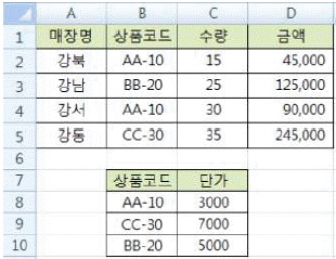아래 워크시트는 수량과 상품코드별 단가를 이용하여 금액을 산출한 것이다. 다음 중 [D2] 셀에 사용된 수식으로 옳은 것은? (단, 금액 = 수량 × 단가)