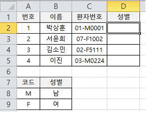 다음 중 환자번호[C2:C5]를 이용하여 성별[D2:D5]을 표시하기 위해 [D2] 셀에 입력할 수식으로 옳지 않은 것은? (단, 환자번호의 4번째 문자가'M'이면 '남', 'F'이면 '여' 임)