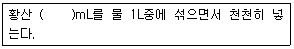 [토양 및 지하수 오염조사기술] 토양시료의 분석에 필요한 2N 황산용액을 조제하고자 할 때 가장 적절한 방법으로 ( )에 알맞은 것은? (단, 95% 황산, 황산의 비중 = 1.84g/mL)