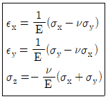 [암석역학] 탄성체에 대하여 아래와 같은 응력-변형률의 관계가 성립하는 경우는 다음 중 어느 것에 해당하는가? (단, σx, σy는 수직응력, εx, εy, εz는 수직변형률, E, v는 각각 영률, 포아송비를 나타낸다.)